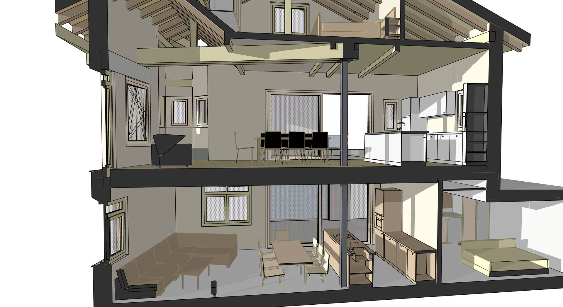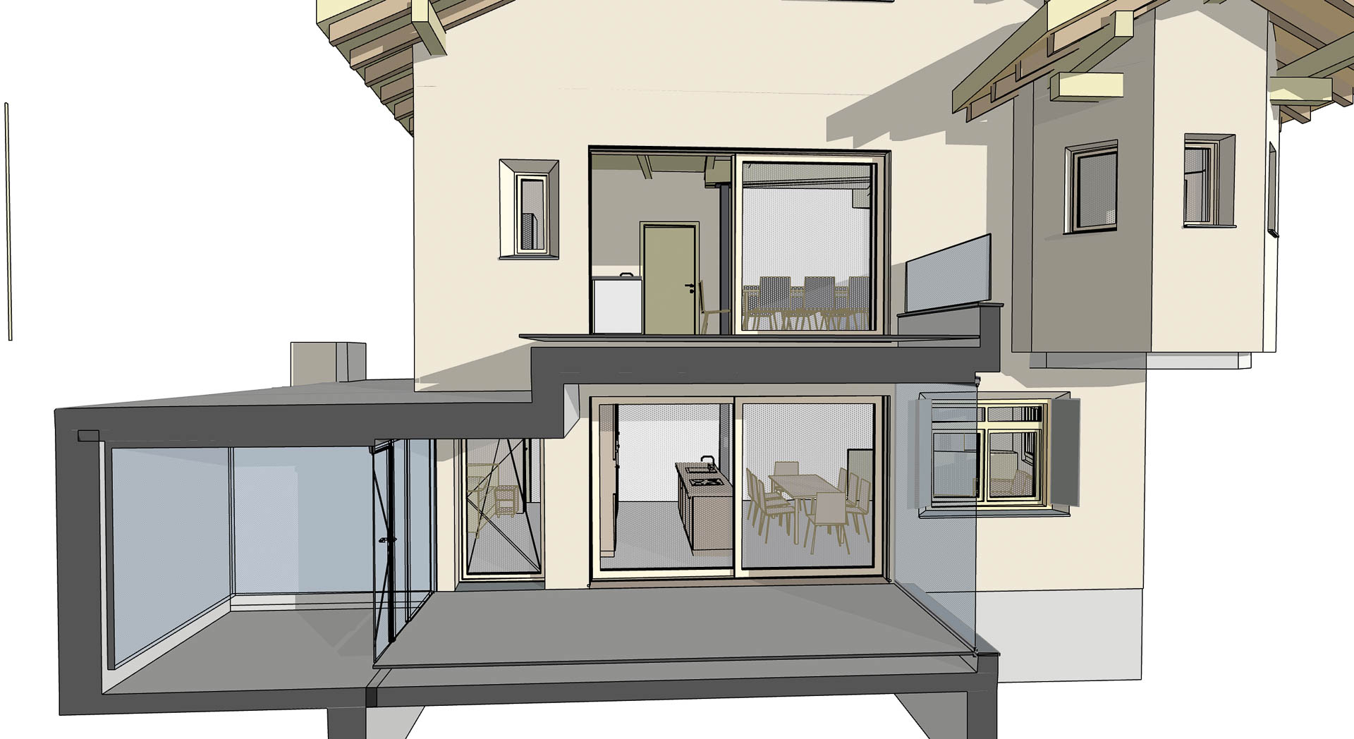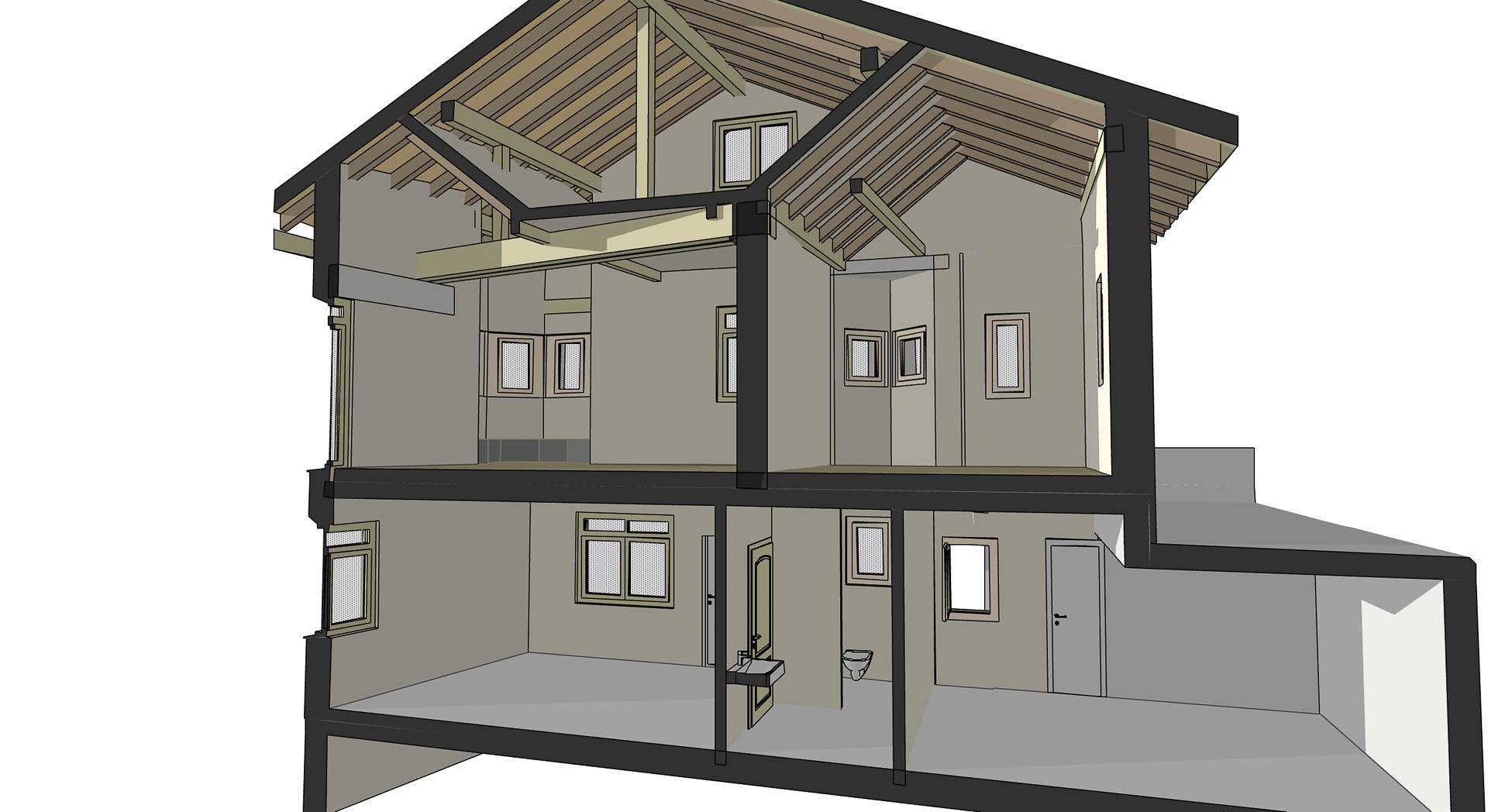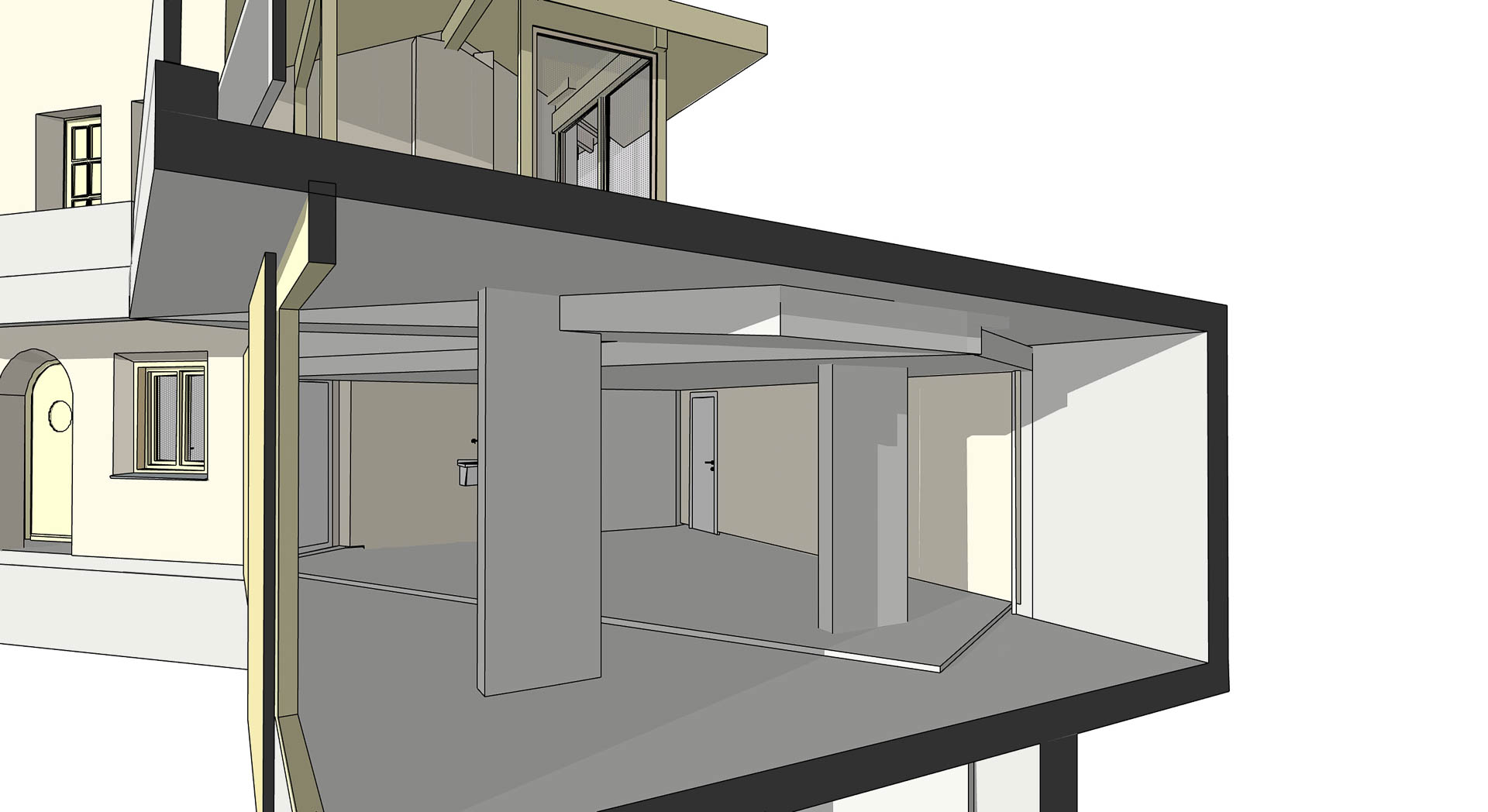 A részben faszerkezetű épület alaprajzának változtatásai miatt számos új teherhordó elem (vasbeton falak, oszlopok) kerül beépítésre. A meglévő épület mellé új teraszt és egy nagyobb garázst valamit egy hegyoldalba elhelyezett gépkocsiparkolót is tervezünk a meglévő tartószerkezeti elemeket megerősítve és felhasználva.