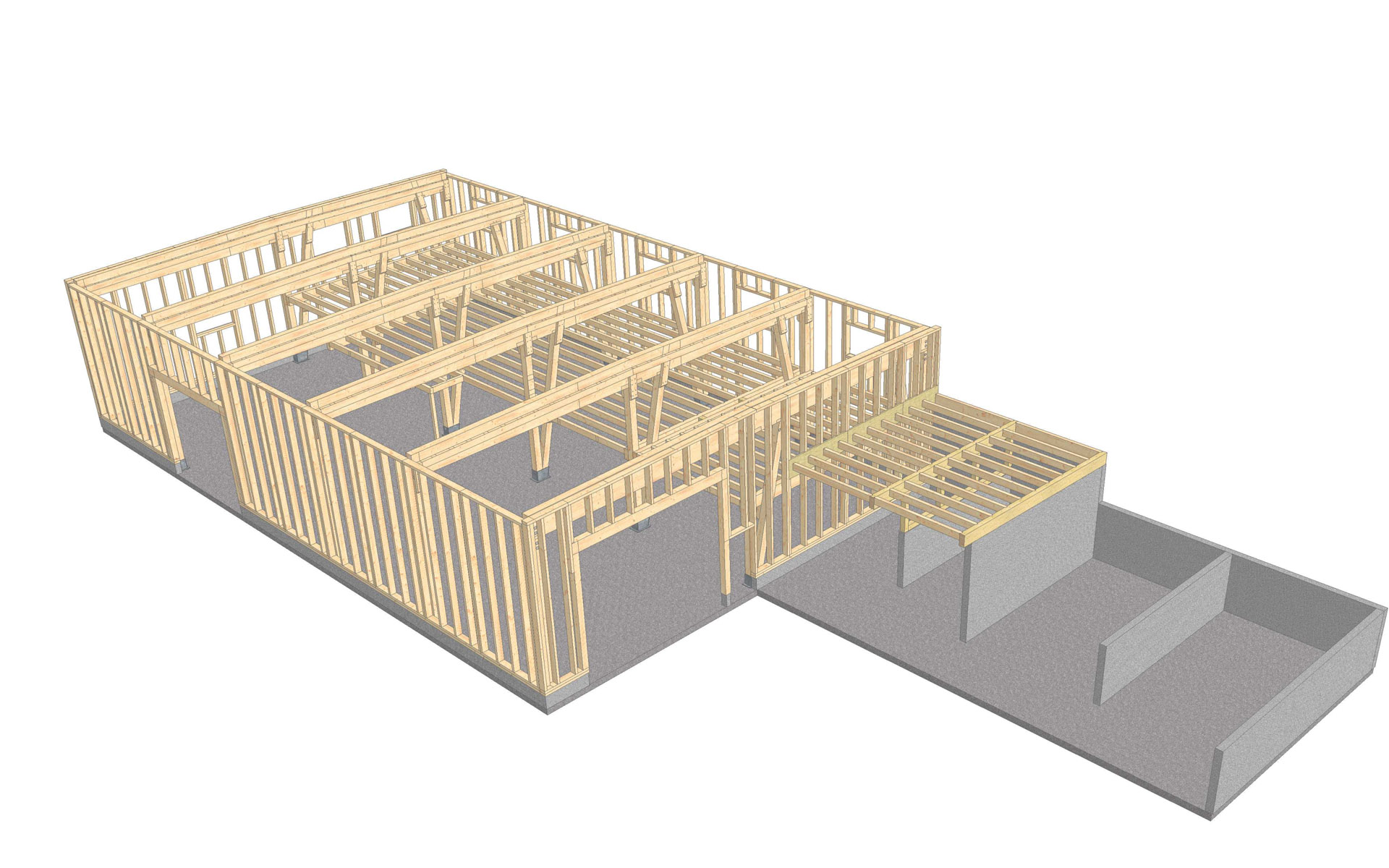 A raktárépület statikai számítását, a fa tartószerkezetek méretezését és a vasbeton lemezalap számítását végeztük el. Végezetül a monolit szerkezetek kiviteli tervei készültek el.
